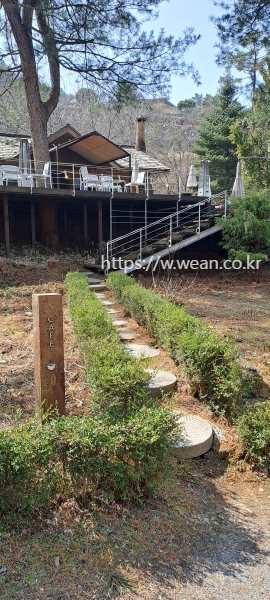 입구 진입로를 통과해 다리를 건너면 계곡 앞에 카페가 있어요.